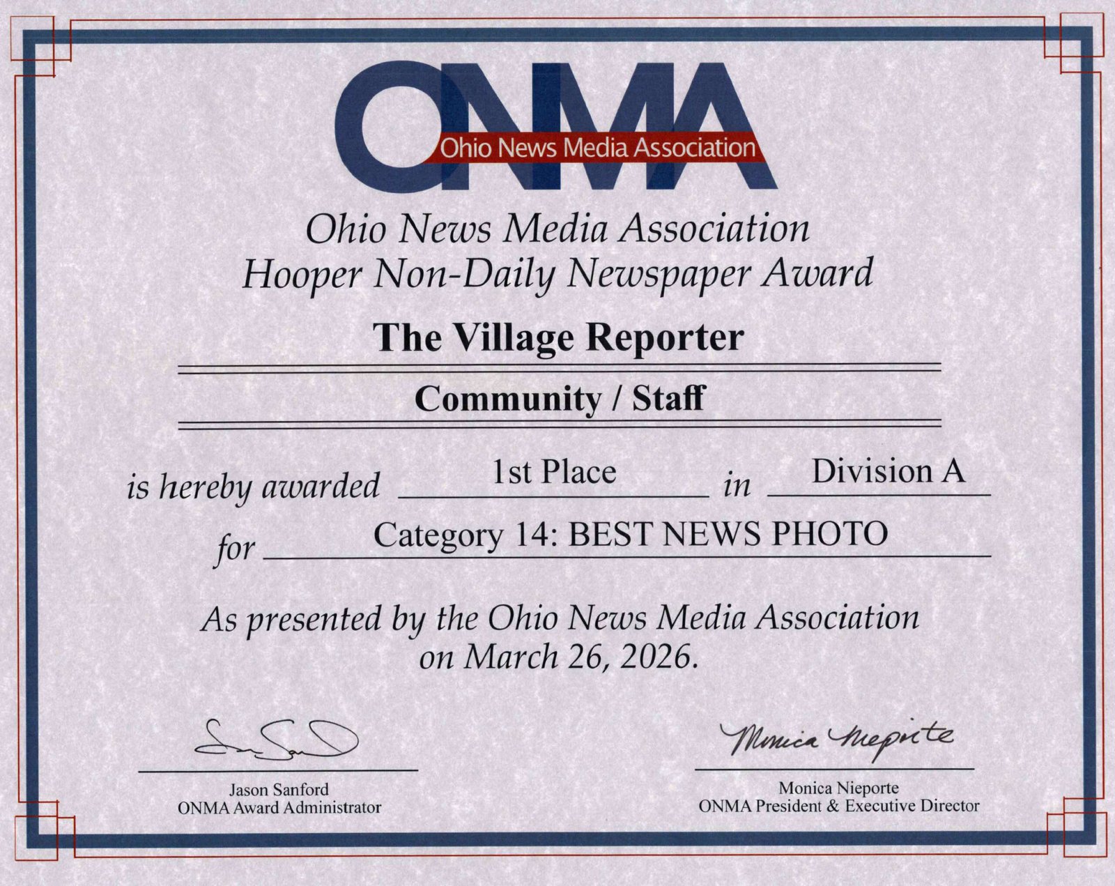 The paper competed in Division A against publications including the Geauga County Maple Leaf, The Gazette, The Telegram of Jackson, Athens Messenger and The Budget, among others. Geauga County Maple Leaf was the only other paper in Division A to match The Village Reporter’s breadth, with wins spread across multiple categories.