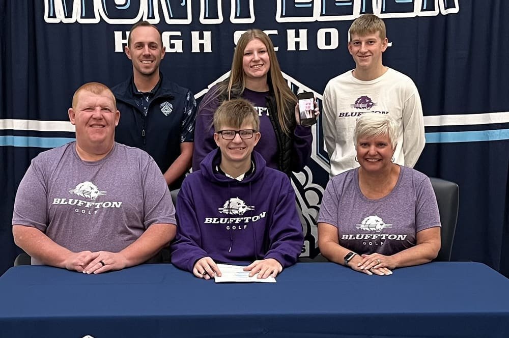 BLUFFTON GOLF … Shown with Drake Sommer as he makes it official are seated Kevin Sommer (father), Drake, Monica Sommer (mother). Standing – Montpelier golf head coach Brandon Shoup, Allie Sommer (sister), Owen Sommer (brother).