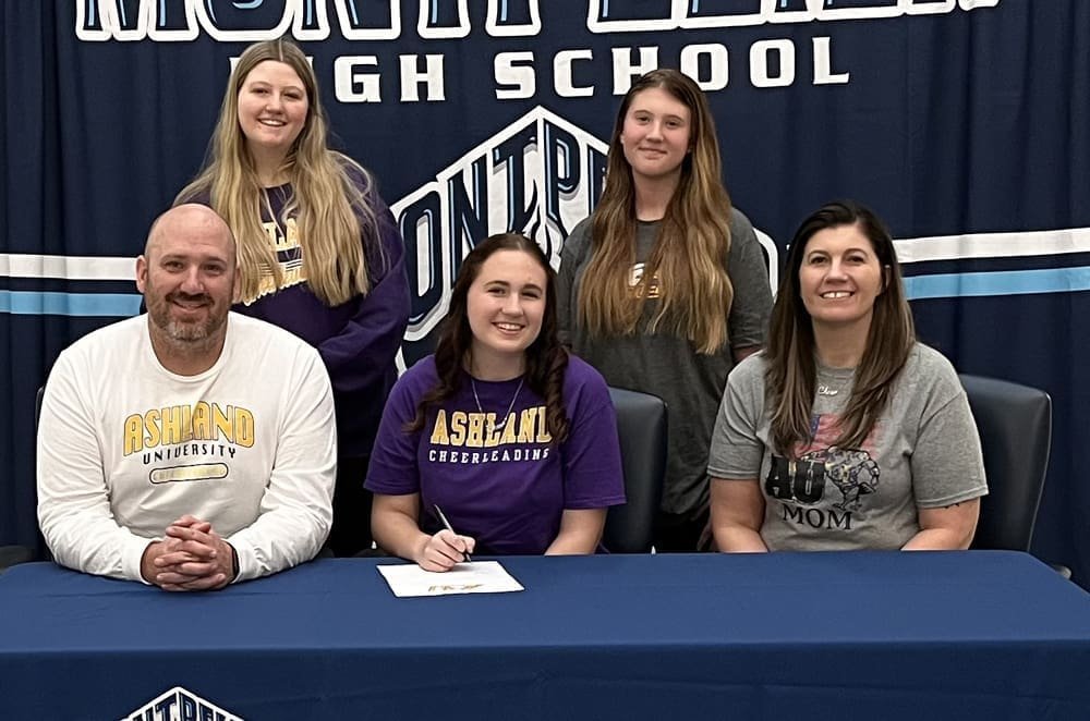 ASHLAND UNIVERSITY CHEER … Shown with Kaitlyn Mills as she makes it official are seated Randy Mills (father), Kaitlyn, Stephanie Mills (mother). Standing – Kaylee Mills (sister), Rose Mills (sister).