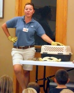 Toledo Zoo Expert Kristin visited the Stryker Public Library Thursday, September 20, 2012. Close to 75 children/parents attended this exciting event to discover some of the interesting facts and animals that are at the Toledo Zoo. Kristin brought 3 live animals to the library with her. The 3 live animals were a white tree frog that was 8-10 years old, an albino hedge hog that is 8 months old, and an armadillo that is 9-10 months old. Excitingly, the children were able to pet the hedge hog and the armadillo. Kristin also showed the children the fur of a tiger and koala while explaining the animals characteristics. She proceeded with a brown bat, the skin of an alligator and the jaw of a sandbar shark. Kristin talked with the children and explained almost every characteristic of every animal she showed. She took questions and happily answered everyone of them. This was a really great experience for the children of Stryker, Ohio, and they surely did enjoy it.