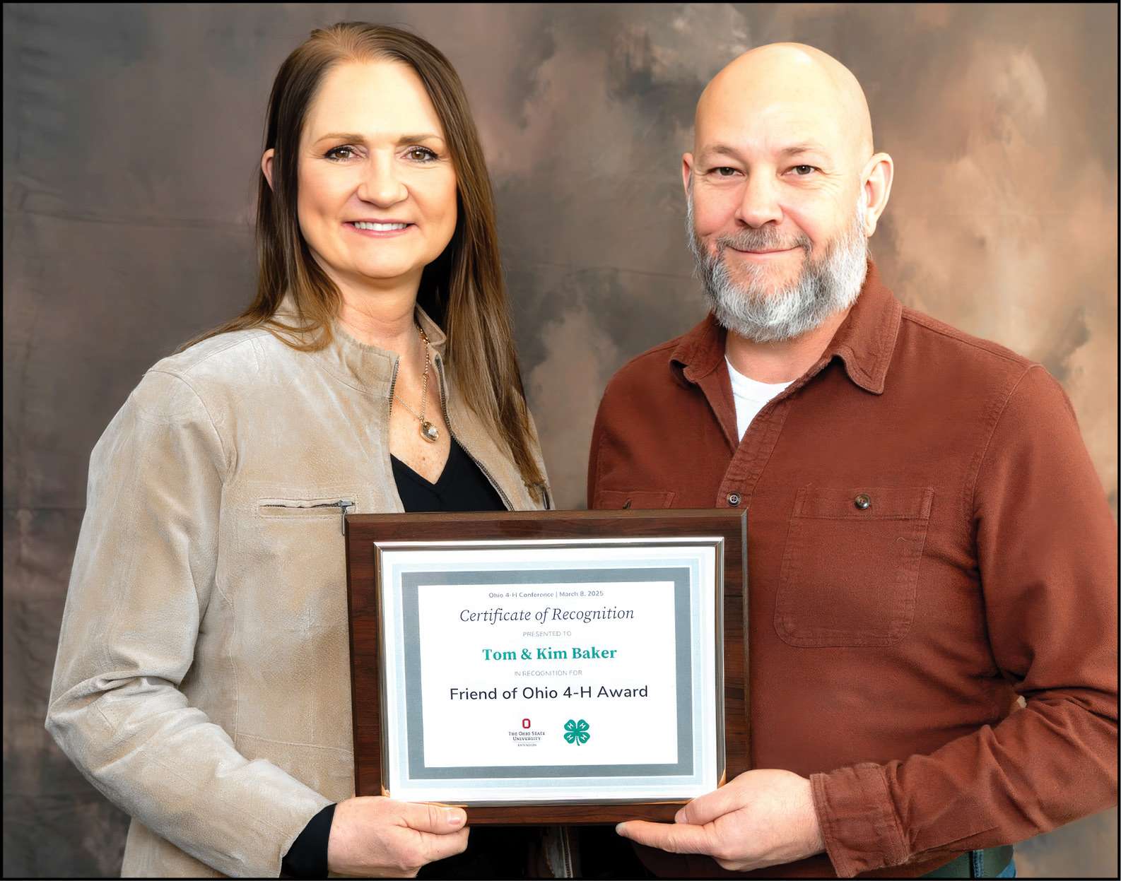 RECOGNIZED FOR SUPPORT … Tom and Kim Baker of Swanton were awarded the Ohio Friend of 4-H Award at the Ohio 4-H Conference on Saturday, March 8, 2025, at the Greater Columbus Convention Center. The Ohio Friend of 4-H Award recognizes an individual, family, business or corporation who have greatly supported the Ohio 4-H Program, in a charitable manner at the county, state, or national level. Ohio 4-H Youth Development is a program of Ohio State University Extension, the outreach arm of the College of Food, Agricultural, and Environmental Sciences. In 2024, 154,687 young Ohioans participated in 4-H clubs, groups, and special interest programs. Ohio has over 13,000 active 4-H volunteers. The Ohio Friend of 4-H Award is sponsored by the Honorable Frederick D. and Dr. Kathryn C. Pepple.