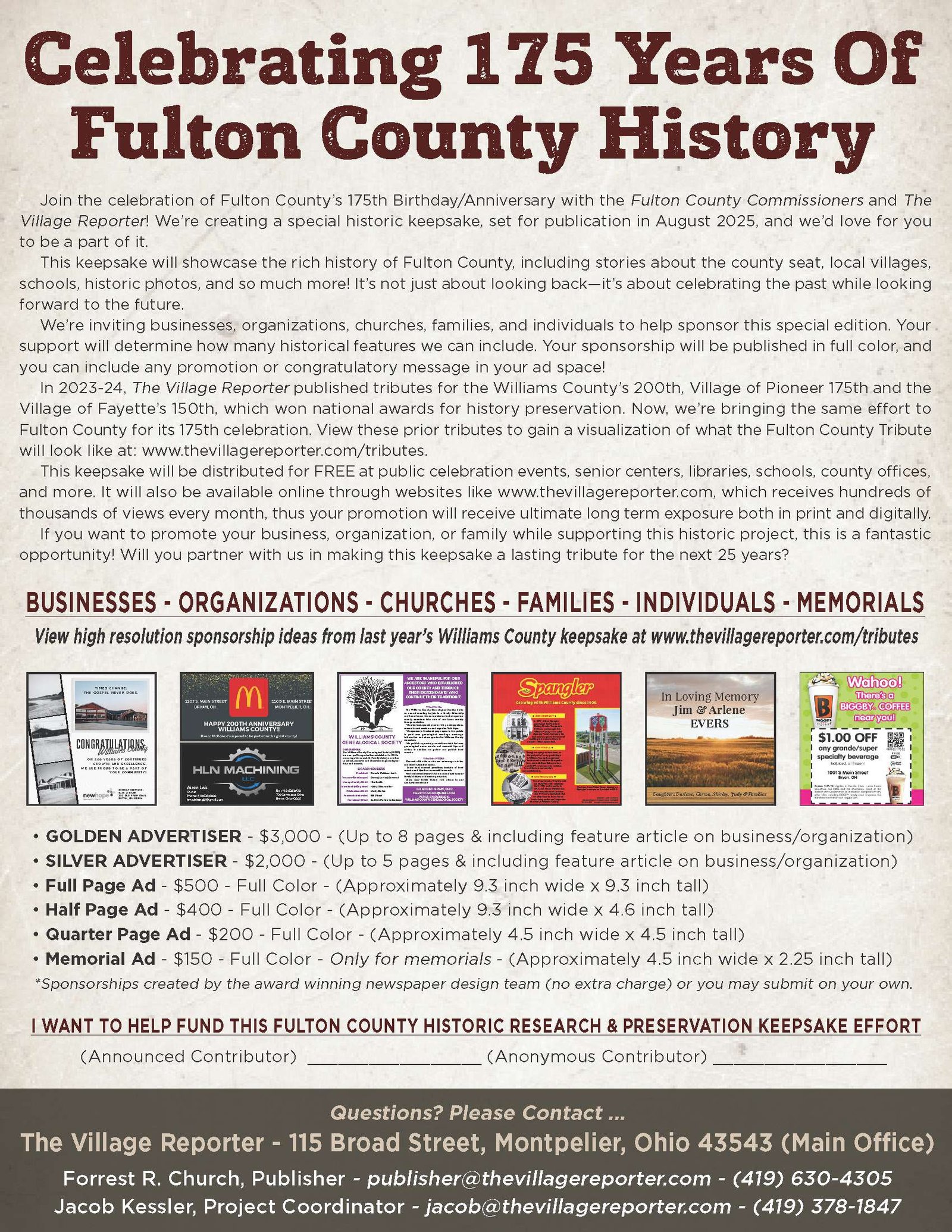 View recent historic tributes published by The Village Reporter for free. These features published in 2023-24 and were utilized as the foundation to local celebrations while winning awards from the National Newspaper Association. The Village Reporter is now focusing efforts in partnership with the Fulton County Commissioners for the county’s 175th Birthday/Anniversary in 2025. If you are considering a sponsorship for this new tribute effort, you may gain valuable ideas from reviewing sponsorships placed in these three recent examples.