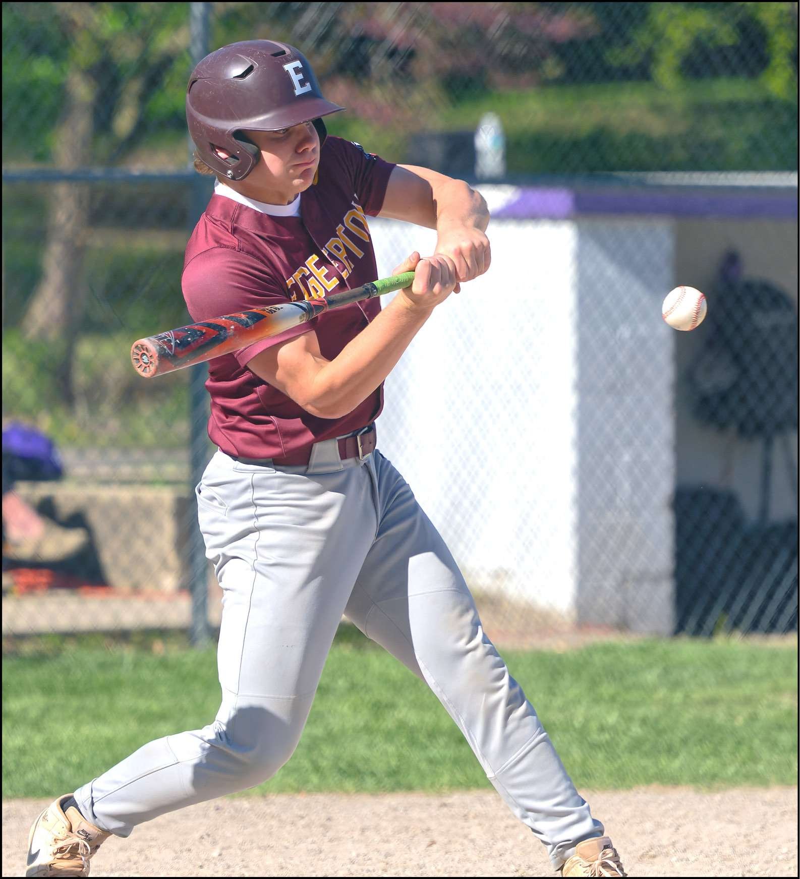 NON-LEAGUE BASEBALL … Edgerton catcher Jackson Flower hits a single to centerfield in the first inning.