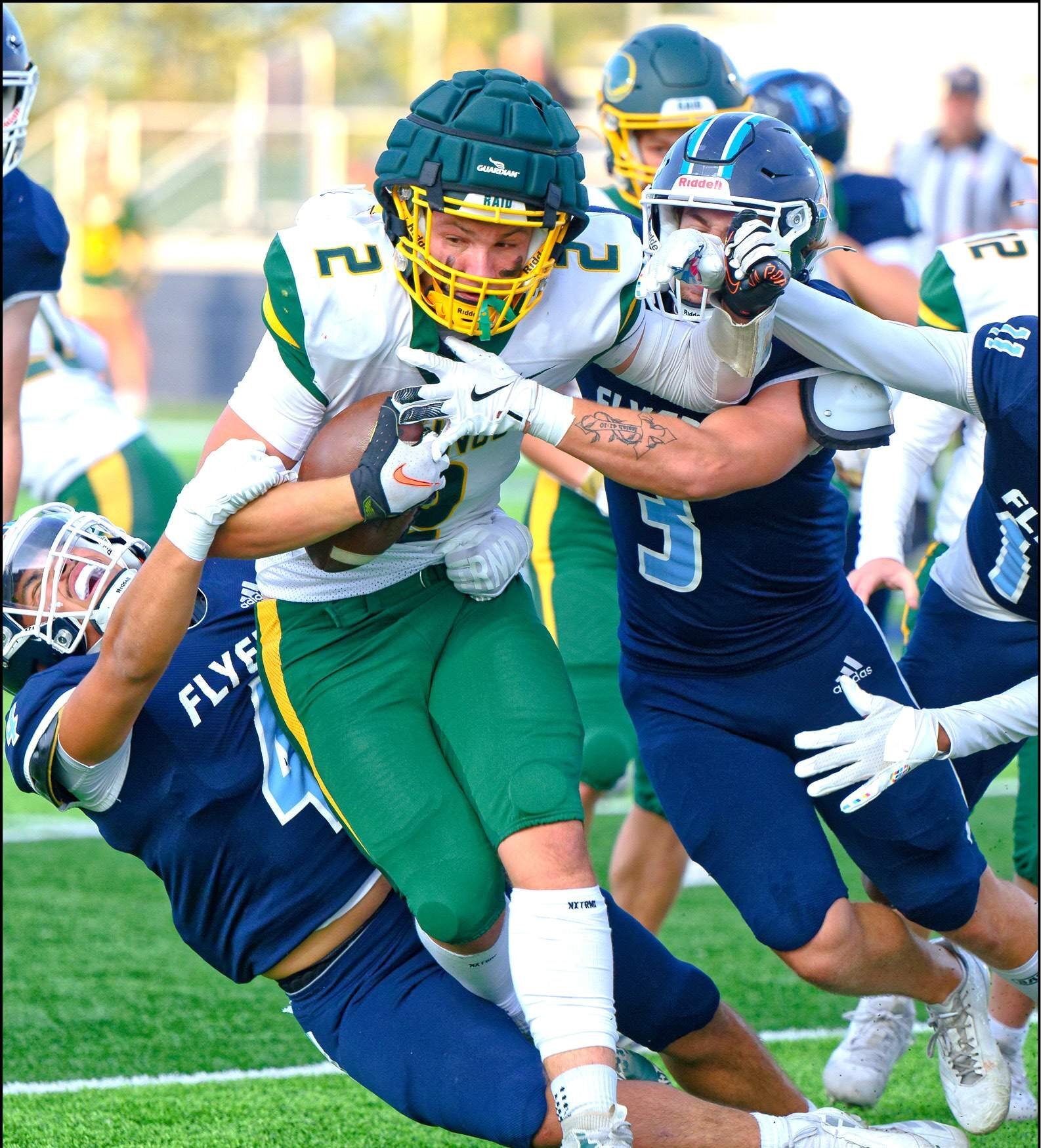 DRAGGING TACKLERS … Alex Mossing keeps his legs going with Lake Flyers trying to bring him down.