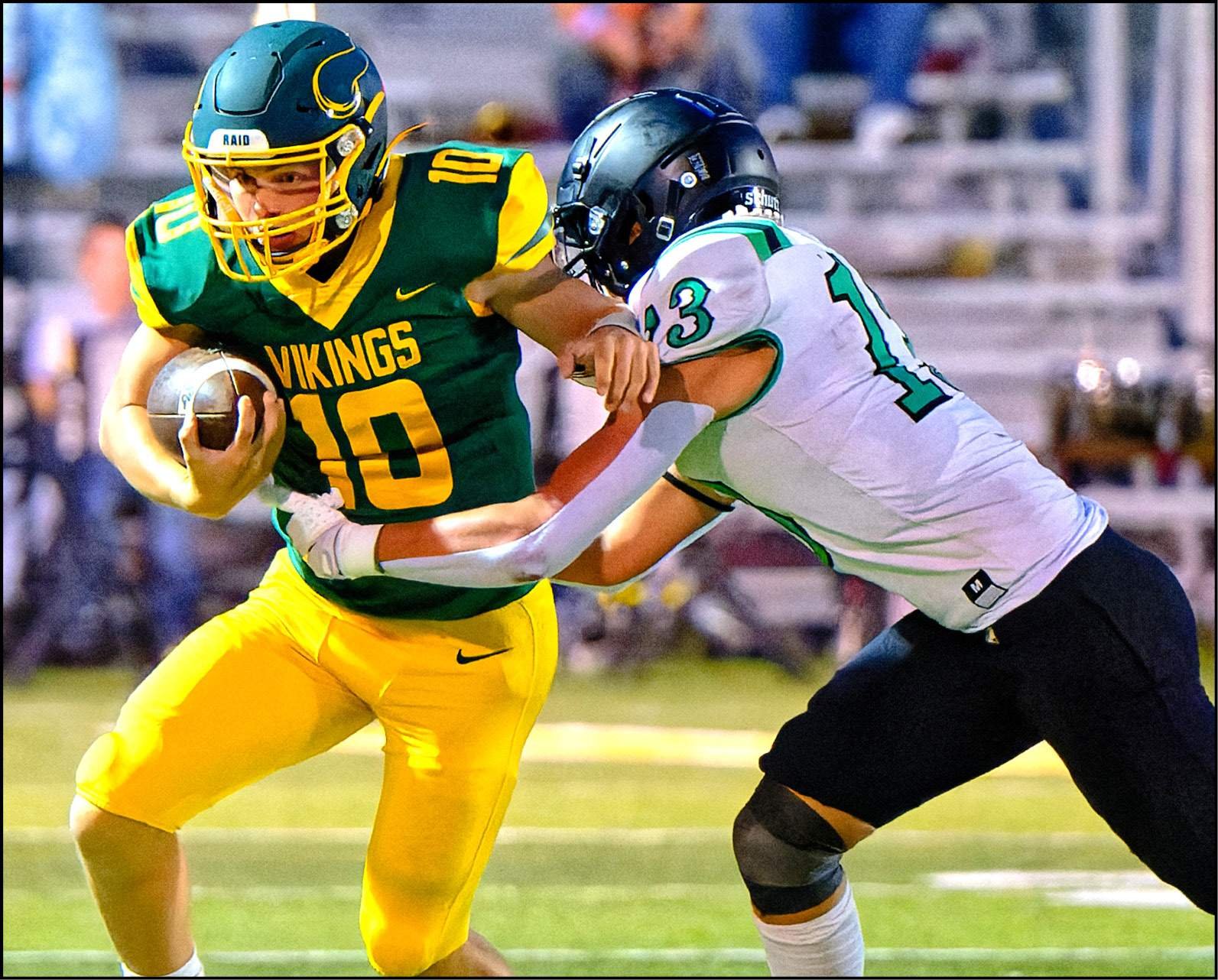 It took the Vikings just five plays after the opening kick to hit pay dirt. Bryce Bolger carried for runs of 19 and 11 to set up Austin Gillen’s 11 jaunt to the end zone just 84 seconds into the game for a 7-0 lead.