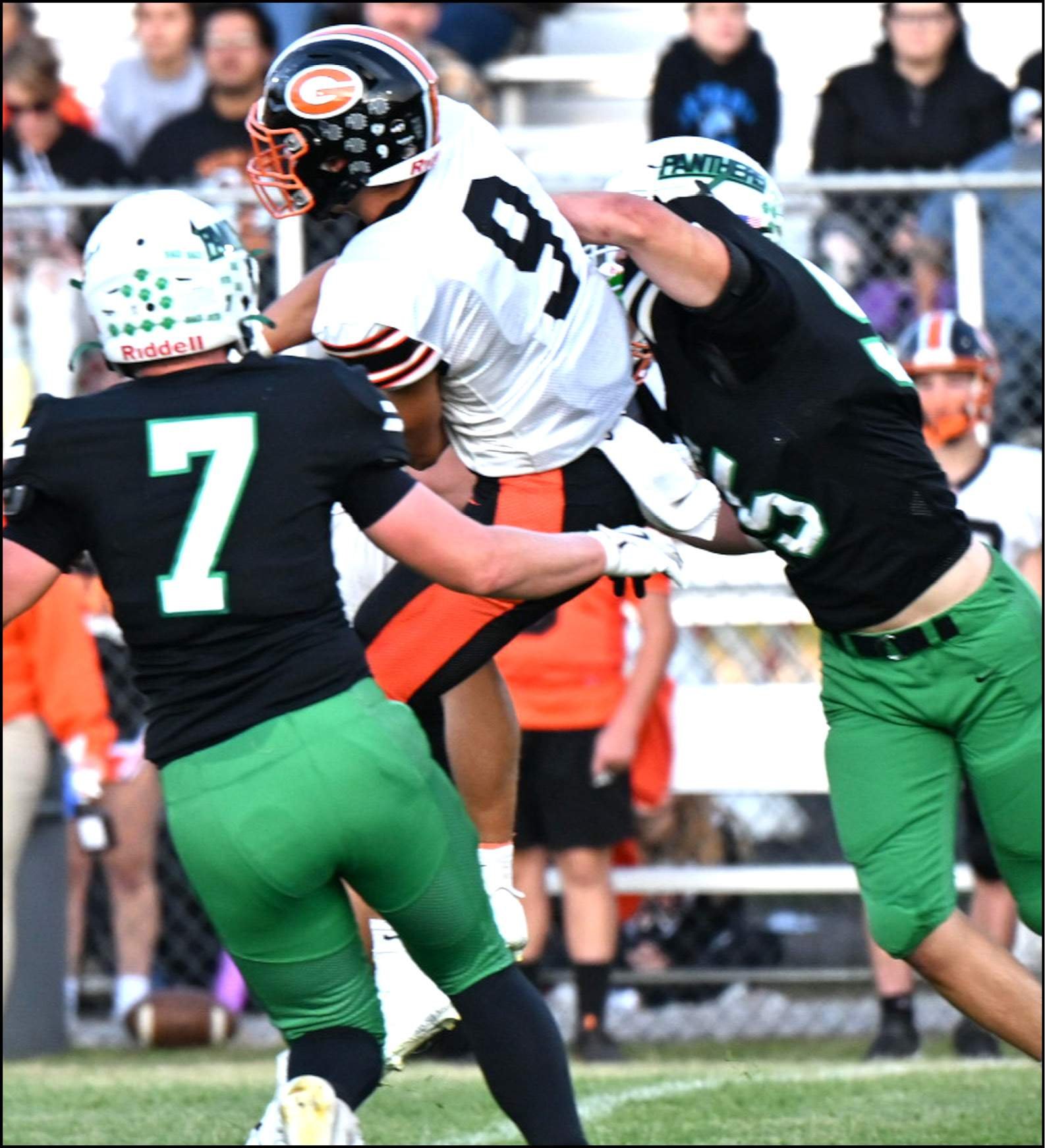 QUARTERBACK PRESSURE … Delta’s Wyatt Flickinger applies the hit to the Gibsonburg quarterback with Gary Valentine (#7) closing in.