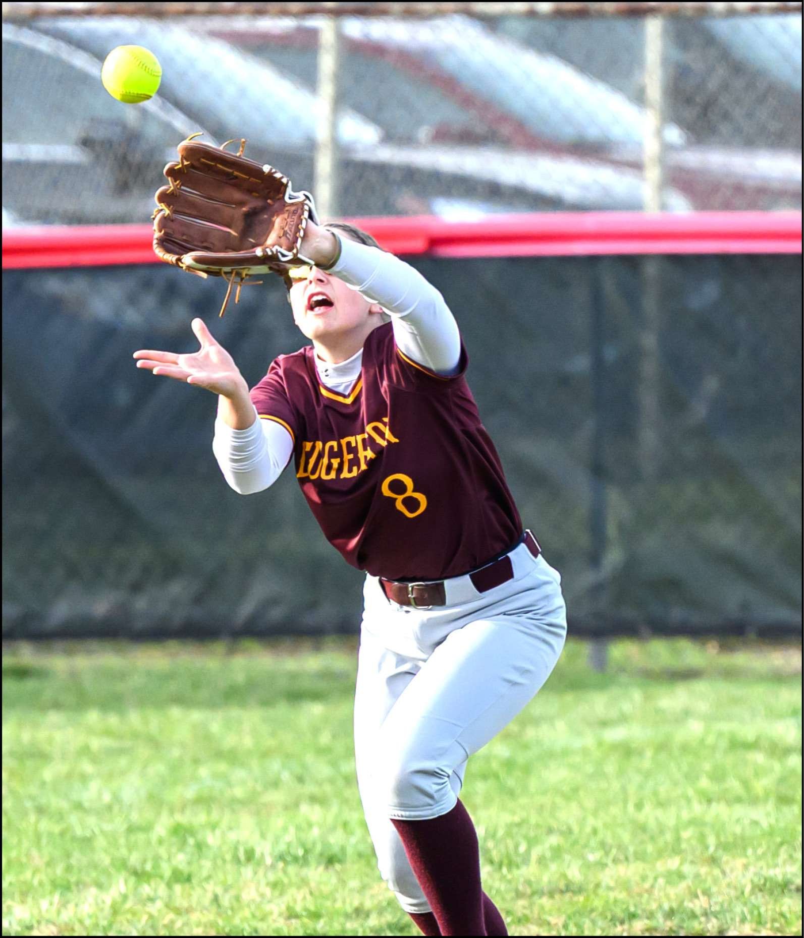ROAD WIN … Edgerton’s Ava Swank comes in from her left field position to make the catch during the Bulldogs 14-2 win at Wauseon.
