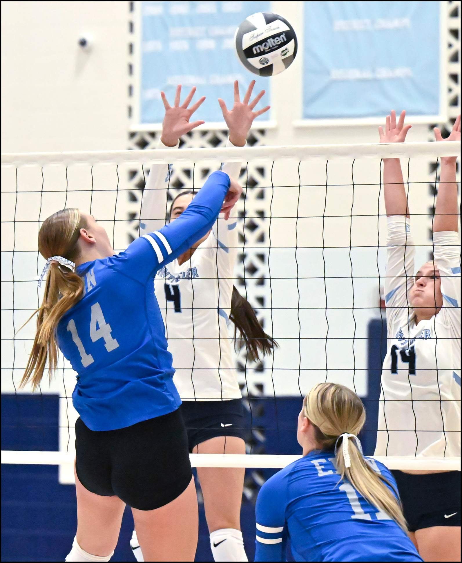 EDON MIDDLE HITTER … Adison Briner tips the ball over the top of two Montpelier blockers.