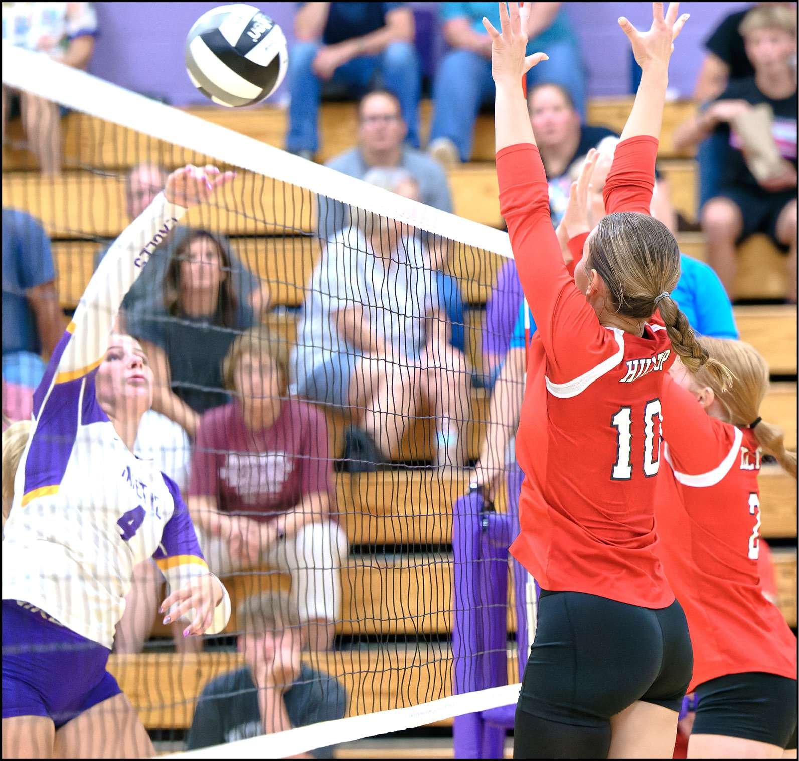 TEAMWORK … Hilltop’s Brynn Rodriguez (red, #10) and Addi Smith go up to block the attack of Fayette’s Kennedy Kunkle.