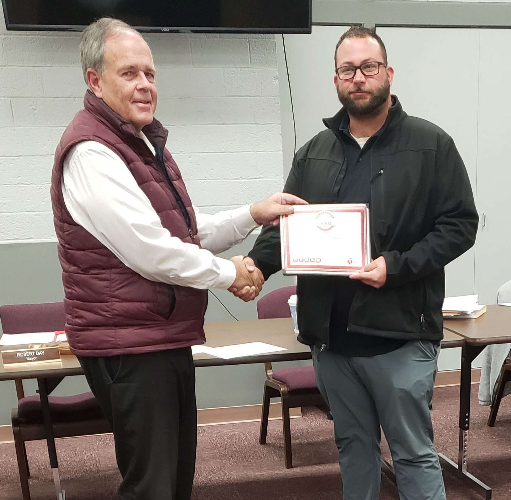 HONORING A HERO … Mayor Robert Day presents Heart Saver Hero Award to C.J. Coburn. Coburn performed CPR on a young female, who is expected to make a full recovery.