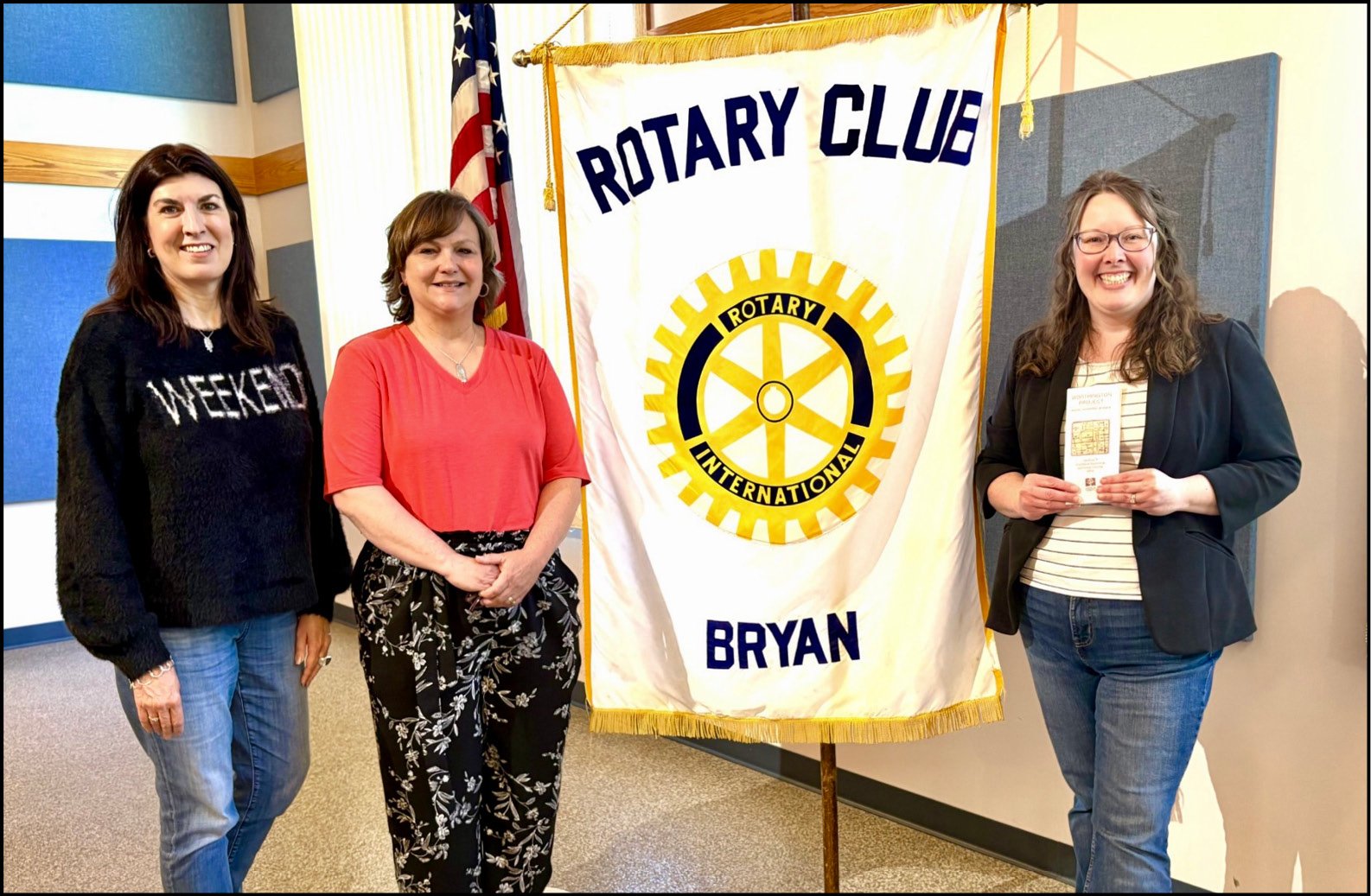 SLAVERY HISTORY … Bryan Rotary Club learned of efforts to save and recognize an abandon African-American cemetery of freed slaves in Defiance County. Sarah Marshall and Renee Hopper of the Defiance Public Library spoke about the Worthington Cemetery in Highland Township, south of Defiance. Archibald Worthington, a freed slave migrated to Ohio where he and his wife raised their children in Section 7 of Highland Township. He designated part of his land to be a cemetery for “his” people. Interments began in 1855 and continued until 1890. In the 1930s, a WPA project conducted Historical Records surveys, finding information on cemeteries and graves of veterans. Twelve tombstones were discovered then. The WPA was disbanded in the 1940s, but records were preserved. The mostly forgotten cemetery was recently discovered through efforts of volunteers using GPR, Ground Penetrating Radar, and search dogs trained to detect human remains and grave shafts. As many as 50 people were thought to be buried in the cemetery. There are no gravestones intact however, parts of markers have been found. After finding conclusive evidence of the cemetery, an Ohio Historical Marker will be placed on June 19 (Juneteenth). Pictured are Rotarian Jenny Horn, speakers Sarah Marchall and Renee Hopper.