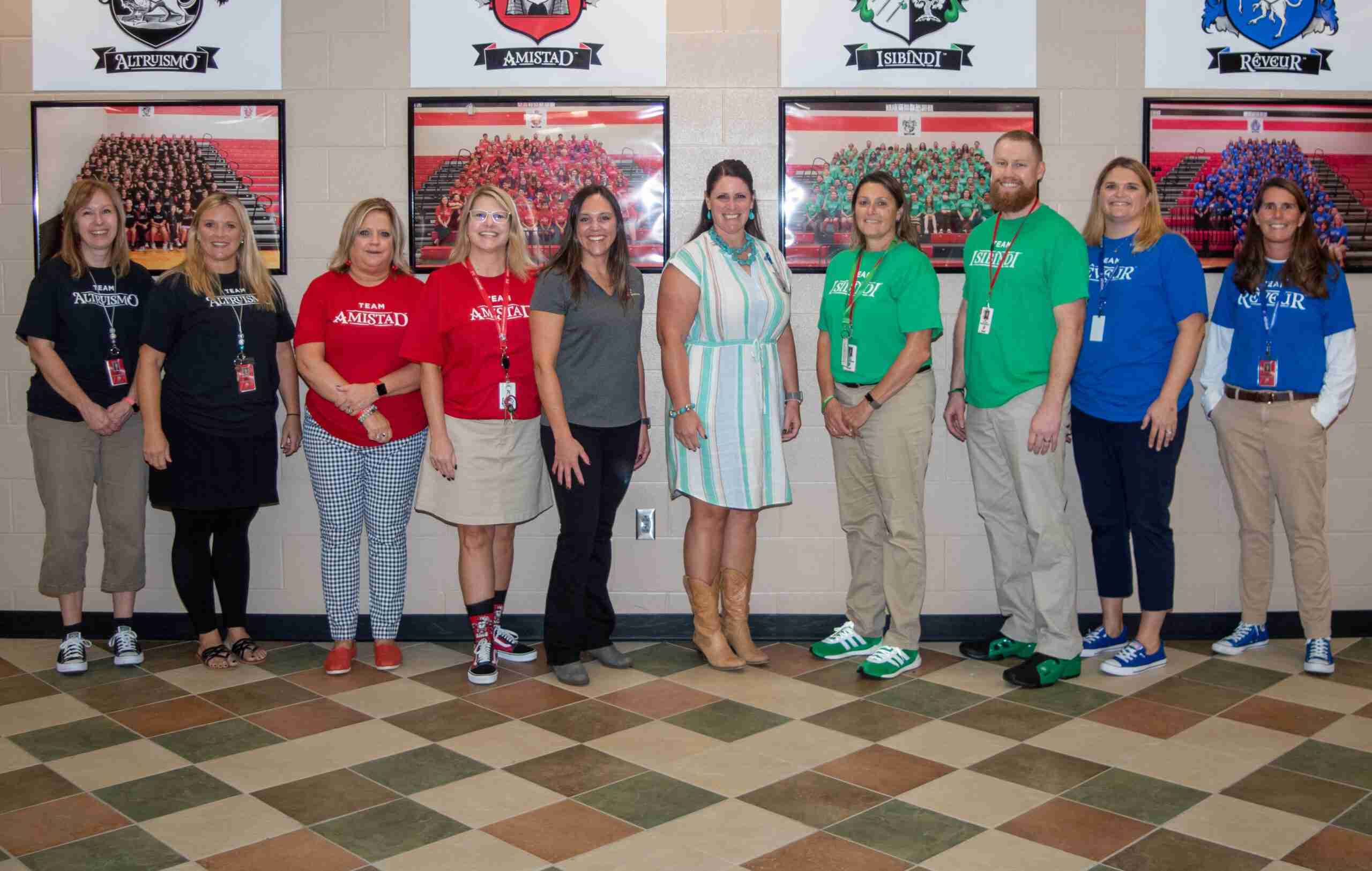 It allows everyone once a week to step away from academics during one period to look at the social and emotional needs of the students,” said Mr. Friess. The shirts were colored to match their house color and also had the house name on them as well.