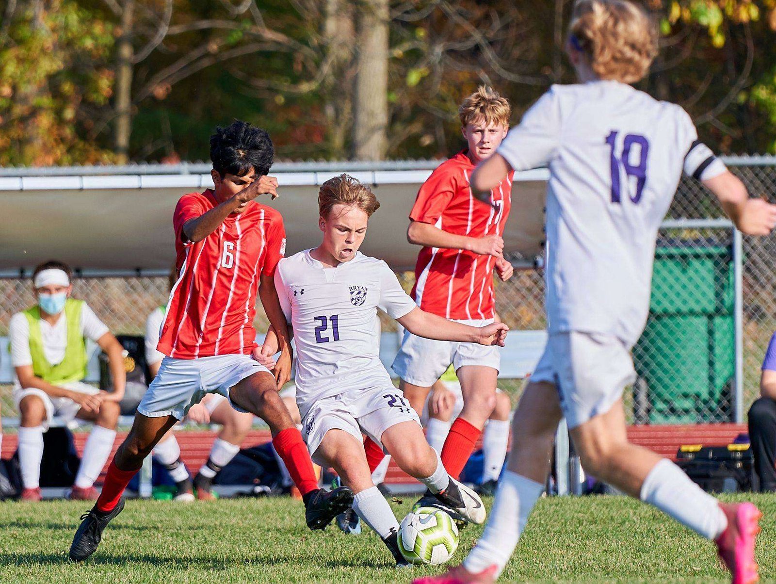 BATTLE FOR POSSESSION … Wauseon’s Benicio Vielma (#6) tries to take the ball away from Dylan Koenig of Bryan. VIEW 797 PHOTOS OF THIS CONTEST ONLINE FOR FREE AT WWW.THEVILLAGEREPORTER.COM. (PHOTOS BY RICH HARDING (STAFF).