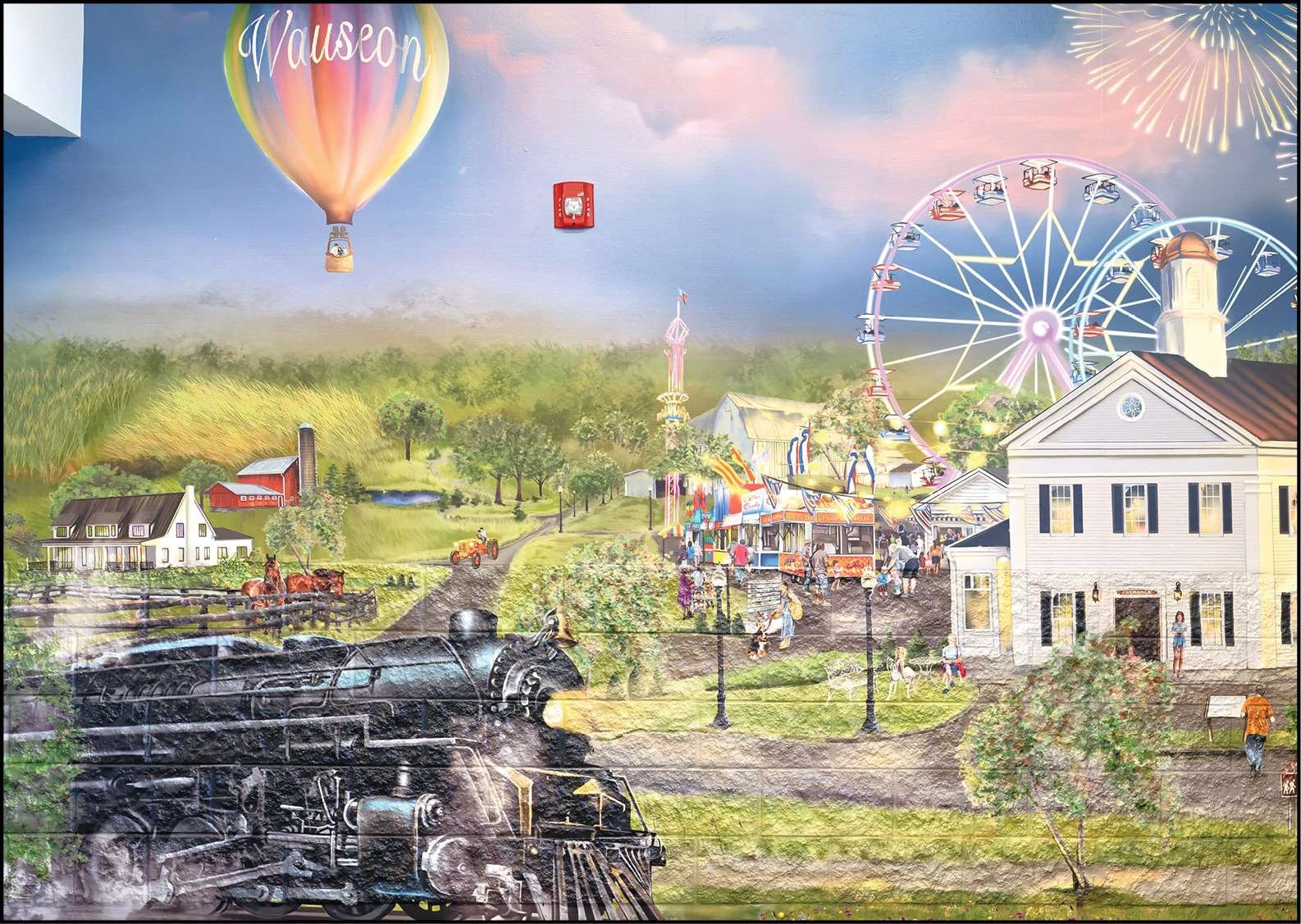 MURAL … A mural was placed inside the store at the grocery side entrance. The artwork highlights iconic features of Wauseon and Fulton County, including the Michigan Southern Air Railway, the Fulton County Museum, the fairgrounds, surrounding farmland, and a hot air balloon bearing the name of the city.