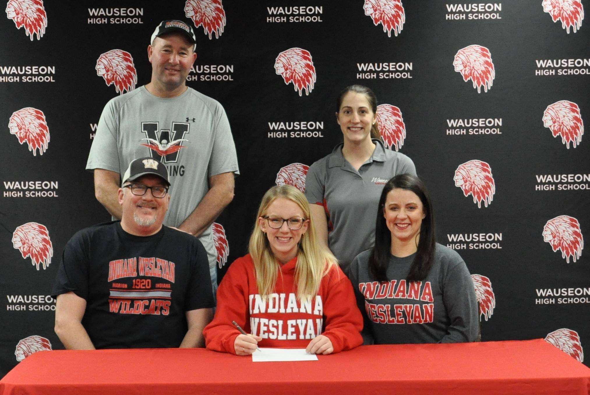 COLLEGE SWIMMING … Wauseon Lady Indians swimmer Megan Carroll recently committed to continue her education and swimming career at Indiana Wesleyan University (NAIA) in Marion, Indiana. Pictured at her signing day are Front row-David Carroll (father), Megan Carroll, Rebecca Carroll (mother). Back row-Wauseon Head Swim Coach Tony Schuette, Wauseon Assistant Coach Brittany Schroeder. (PHOTO PROVIDED)