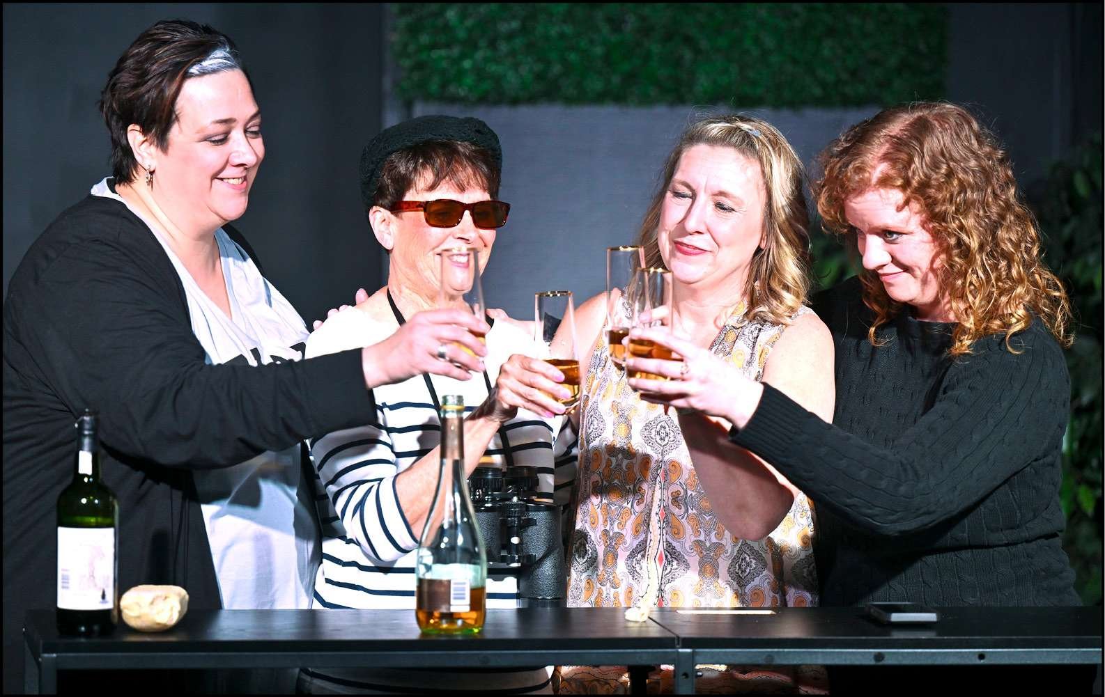 CHEERS … Amber Simmons as Marlafaye, Marcia Bidlack as Dot, Kathy Kennedy as Randa and Chelsea Boyd as Jinx perform the final scene from “The Savannah Sipping Society,” presented by Williams County Community Theater at the Goldsmith Theater in Bryan.