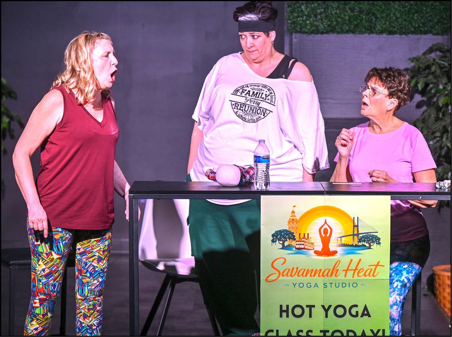 LOTS OF LAUGHS … Kathy Kennedy as Randa, Amber Simmons as Marlafaye and Marcia Bidlack as Dot meet during a hot yoga class in a scene from “The Savannah Sipping Society.”