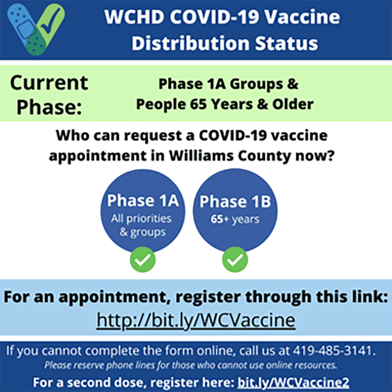 - People who are 65 years or older in Williams County can now register for a COVID-19 vaccine. To register, complete the online form on the WCHD website. Attached is a flyer that can be printed to share vaccine registration information.