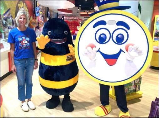 SPANGLER CANDY WORLD OPEN HOUSE … Niki Mosier, Vice President of Human Capital of Spangler Candy Company (left), poses for a photo with a pair of mascots, Bit-O-Honey and Dum-Dums, during the WEDCO Manufacturing Month open house on Thursday, October 2, at Spangler Candy World.