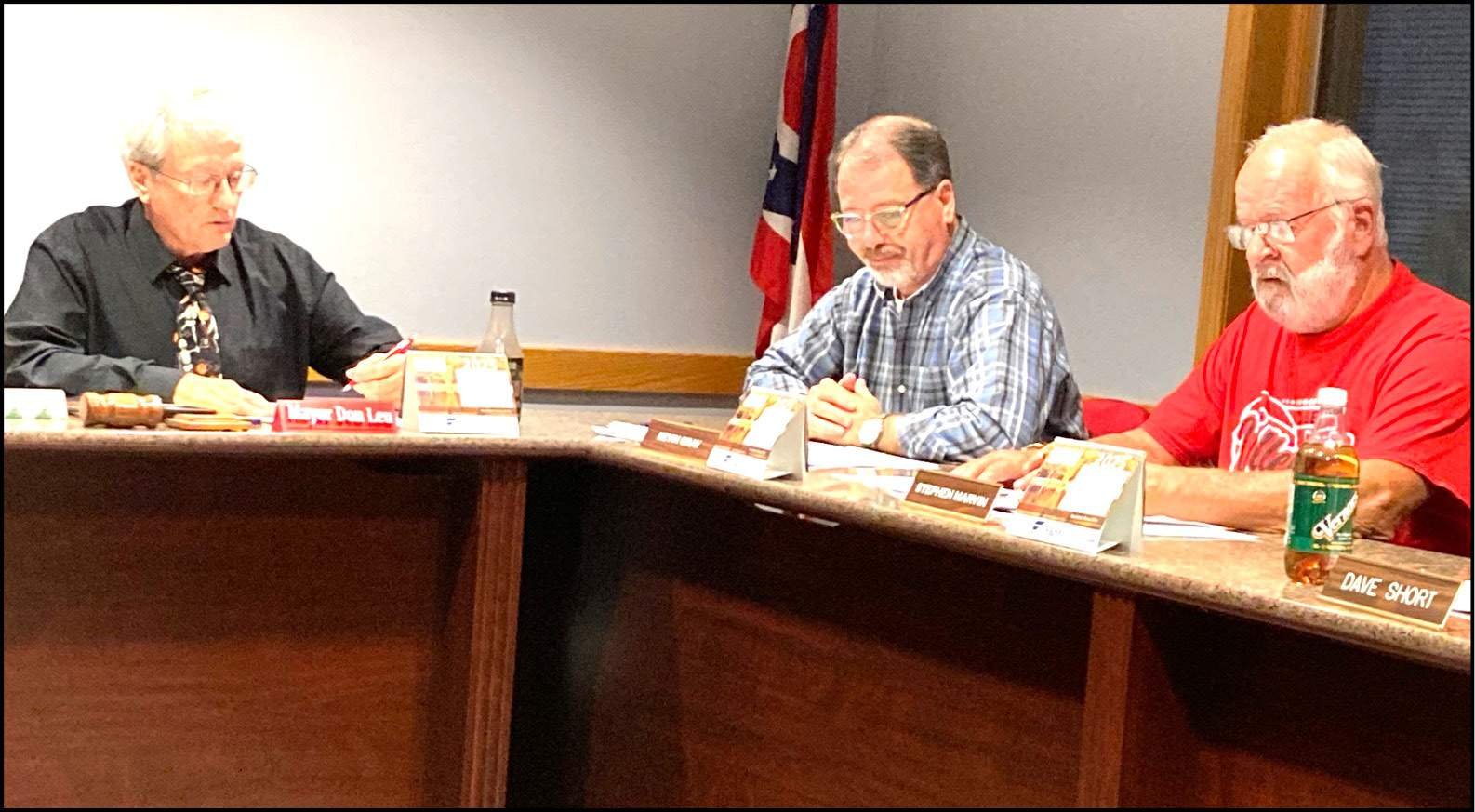 COUNCIL MEETING … West Unity Mayor Don Leu (left), along with council members Kevin Gray (middle) and Stephen Marvin (right), discuss the proposed parks renewal tax levy at its council Meeting on Thursday, October 9.