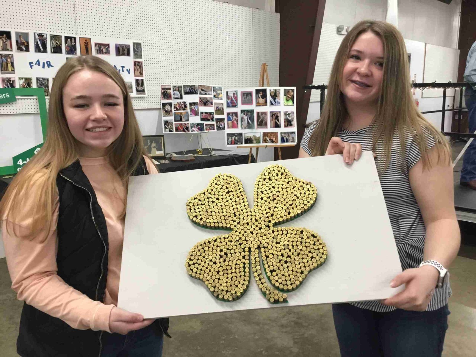 HANDMADE AUCTION ITEMS…Many of the items in both the Silent Auction and the Live Auction at the March 5, 2022 4-H Banquet were homemade from cakes and quilts to this unique work of art. Cassidy James who made the 4-H symbol out of gun shells displayed it with Olivia Saul before it sold for $85.