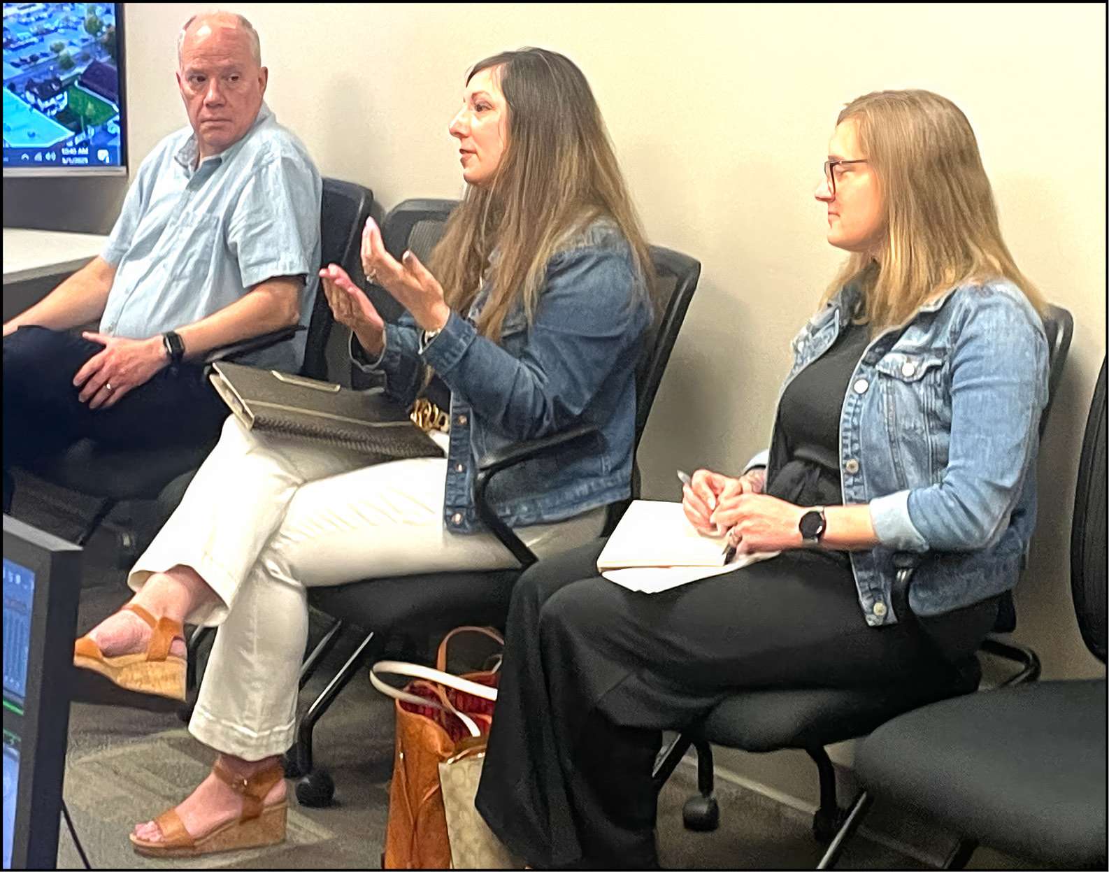 HOUSING DISCUSSION … Darby Hildebrandt (left) of Catholic Charities and Jennifer Martin (right) discuss their plans to support the Williams County housing crisis with the commissioners.