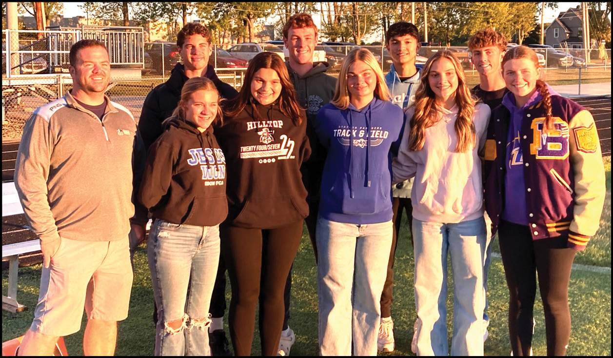 FCA WORSHIP TEAM … Taking part of the Fellowship of Christian Athletes Fields of Faith event held Wednesday, October 8 at Hobe Krouse Field in Montpelier were front row from left, Mike Wortkoetter, Montpelier FCA Facilitator, Addy Fritch, (Edon High School); Loren Rodriguez, (Hilltop High school); Grace Froelich (Stryker High School); Anna Burt (North Central High School) and Josey Arnold (Bryan High School). Back row from left: Will Donovan (Stryker High School); Kenneth Smeltzer (Montpelier High School); Braylon Hopper (Montpelier High School), and Talen Reinbolt (North Central High School).
