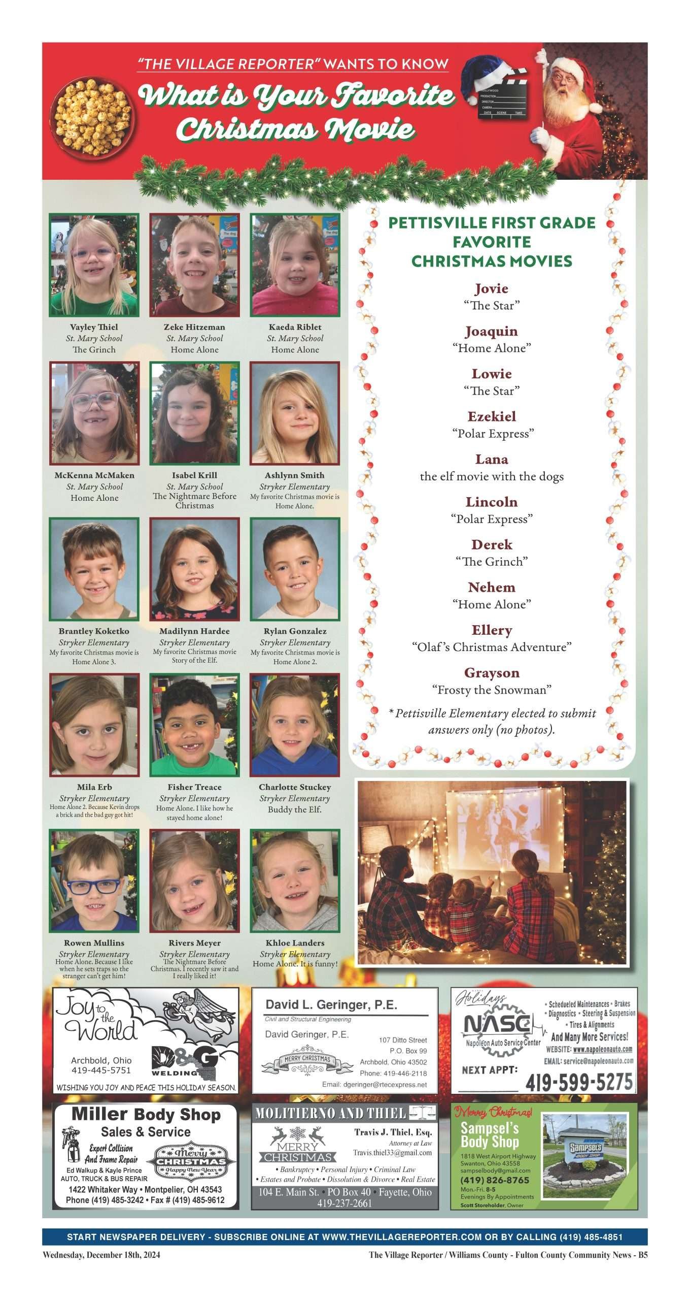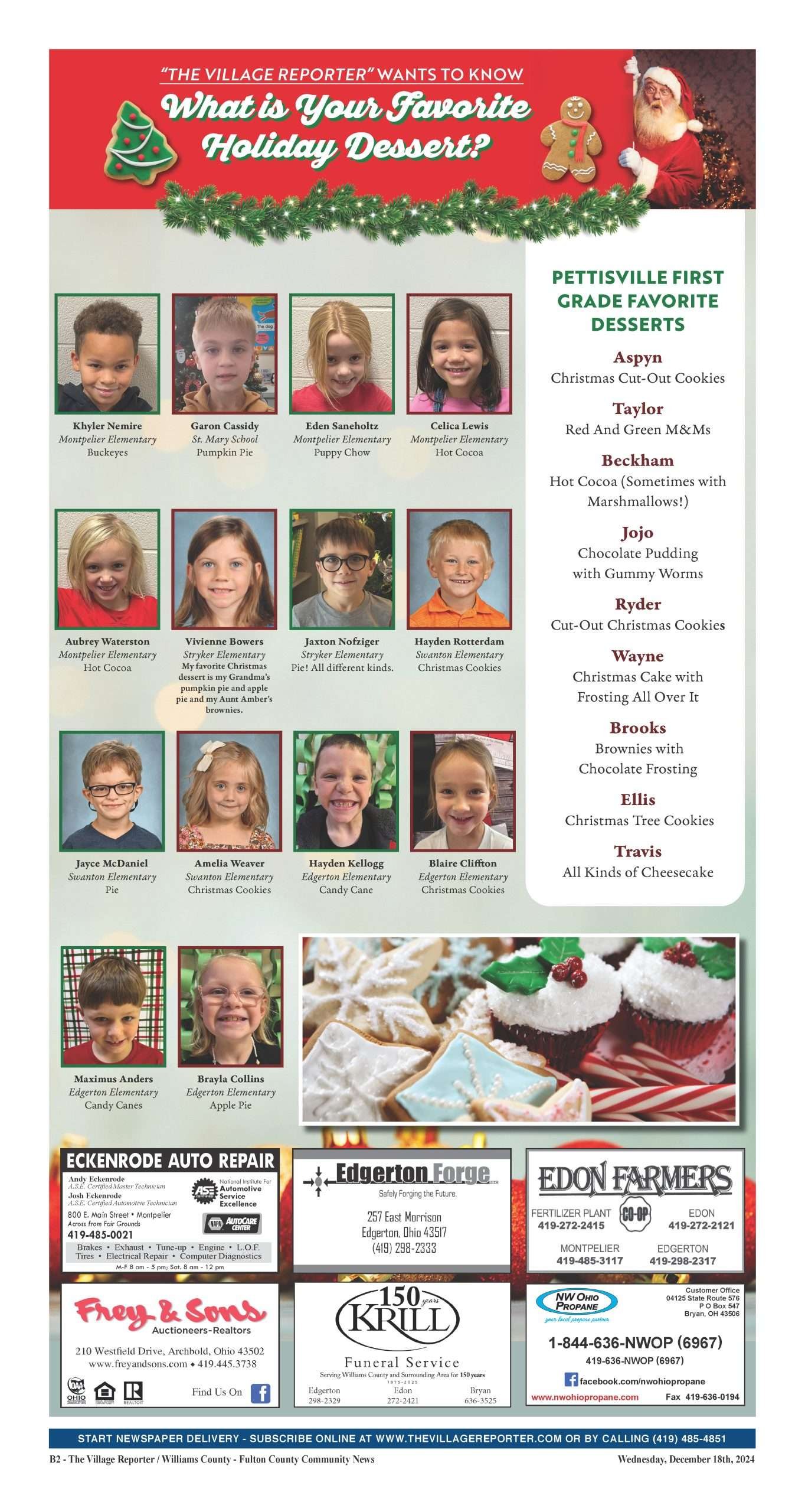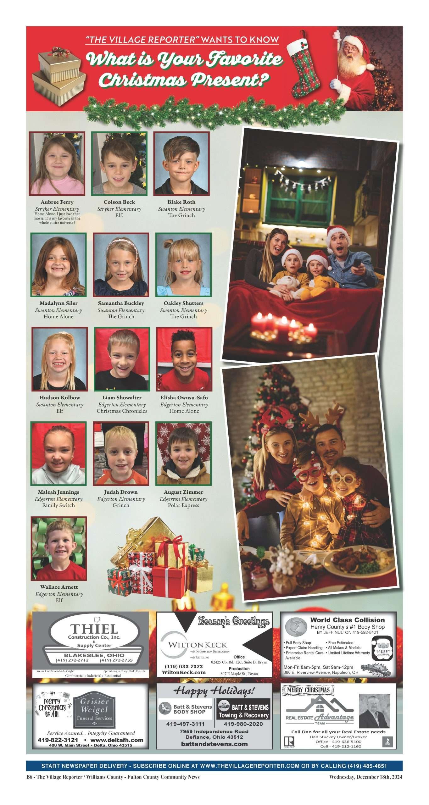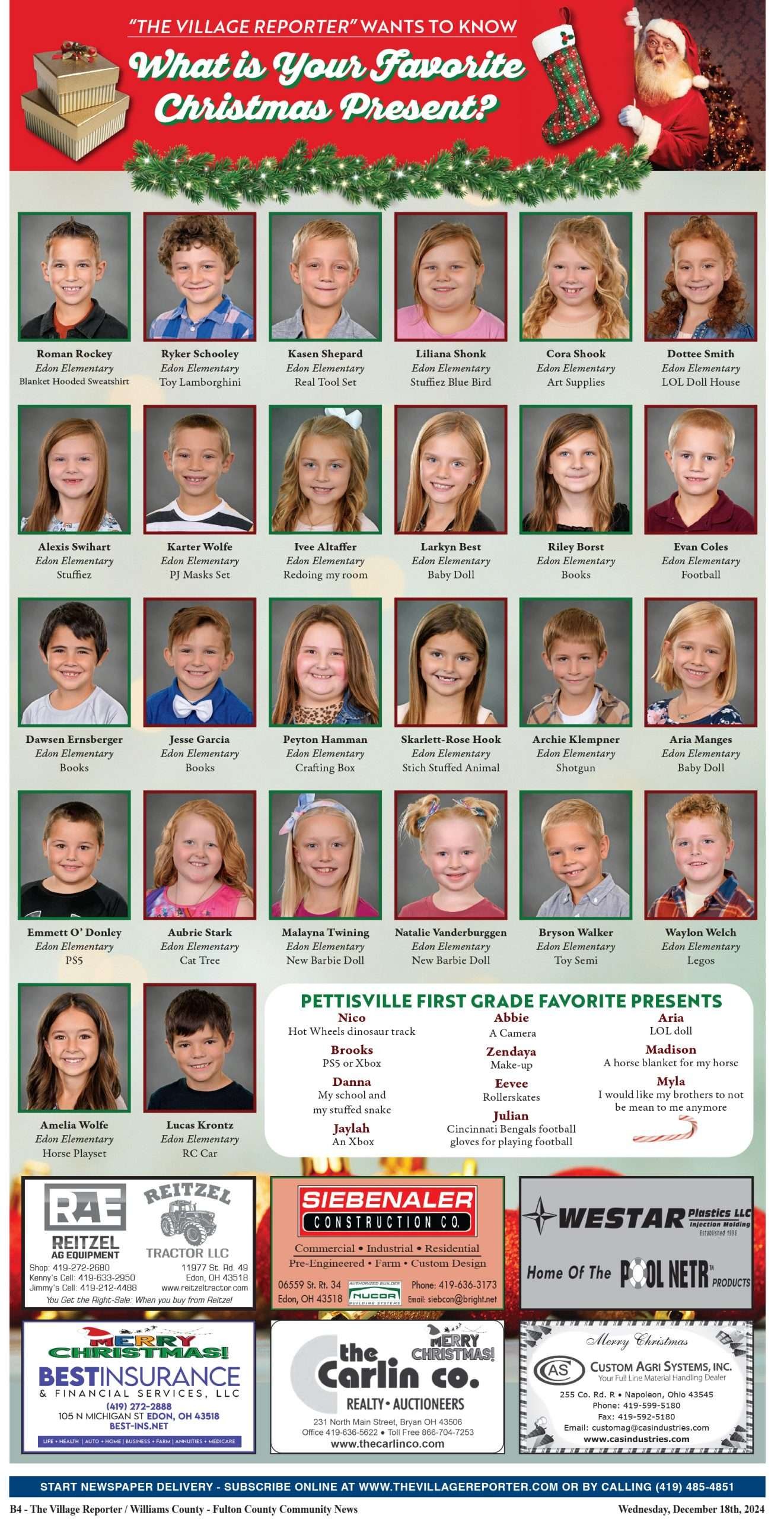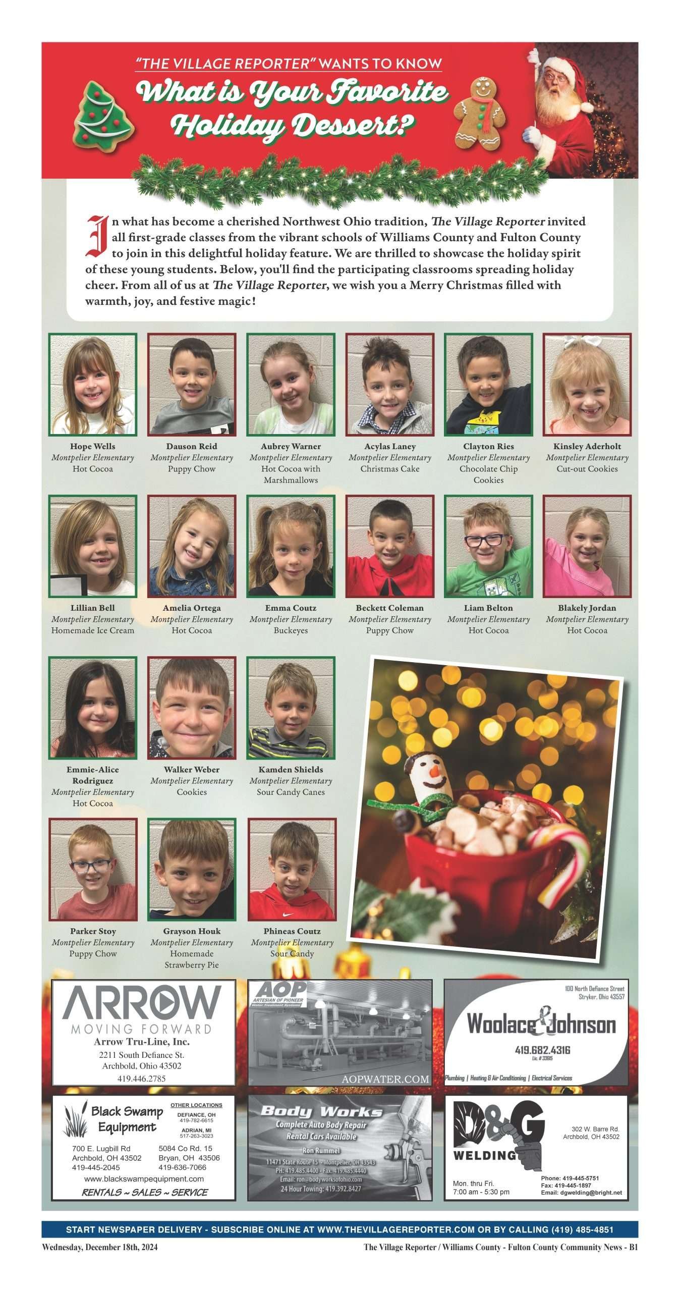 In what has become a cherished Northwest Ohio tradition, The Village Reporter invited all first-grade classes from the vibrant schools of Williams County and Fulton County (16 ) to join in this delightful holiday feature. We are thrilled to showcase the holiday spirit of these young students. Below, you’ll find the participating classrooms (all were invited) spreading holiday cheer.
