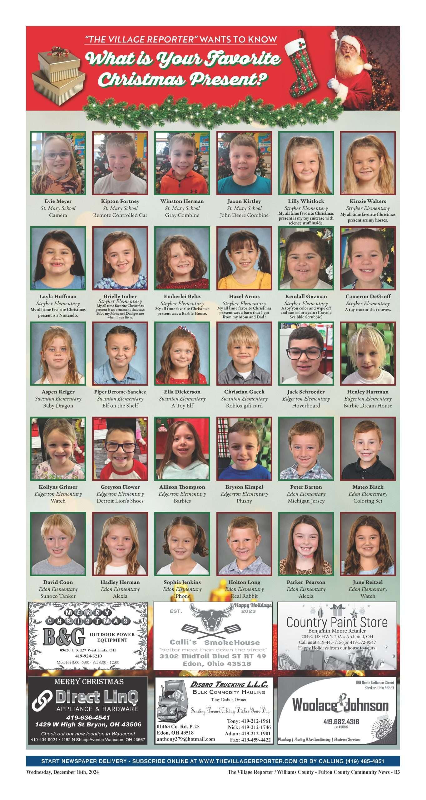 From all of us at The Village Reporter, we wish you a Merry Christmas filled with warmth, joy, and festive magic! Thank you to our local young students who brought a smile to our communities with your answers.