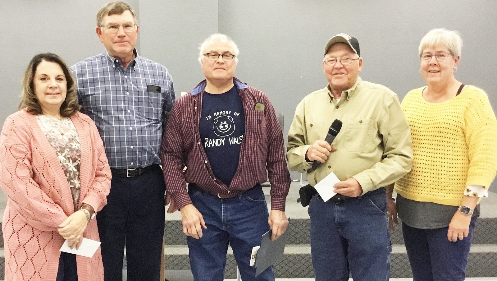 PRESENTATIONS MADE …Pam Goll, representing the Williams County Ag Society, was given a donation of $2000 presented by Williams County Pork Producers (WCPP) Vice President Garold Keppeler. Keppeler also presented $2000 to Bob and Stacy Walkup, standing next to WCPP President Paul Haines, for the Veterans building fund.