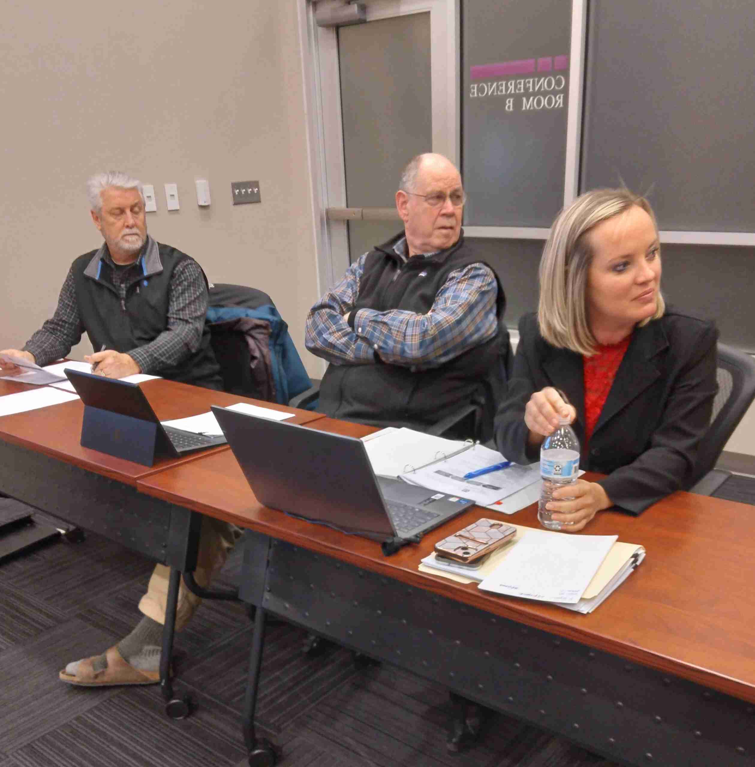 ASSIGNING OFFICERS … Williams County Port Authority chair David Newcomer, center, led a discussion on the Poggemeyer Design Group, to help determine the direction of the port authority. The first order of business was to assign a port authority officer to communicate. (PHOTO BY DANIEL COOLEY, STAFF)
