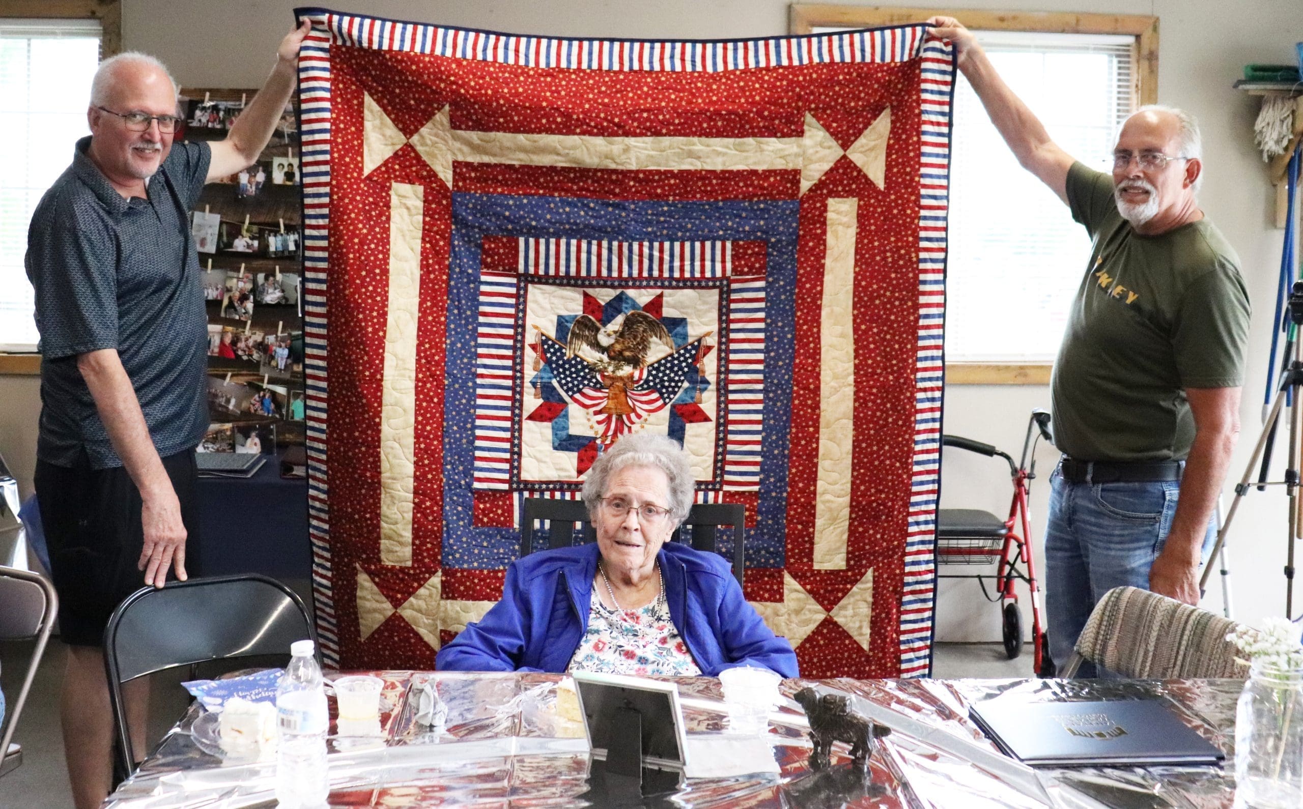100TH BIRTHDAY CELEBRATION … Stewart (middle) sits in front of her Quilt of Valors held by her sons DeWayne Stewart (left) and Jake Stewart (right). The quilt was presented to her at her birthday party by a member of the Women’s Veteran’s Initiative. (PHOTO BY JENNA FRISBY / THE VILLAGE REPORTER)