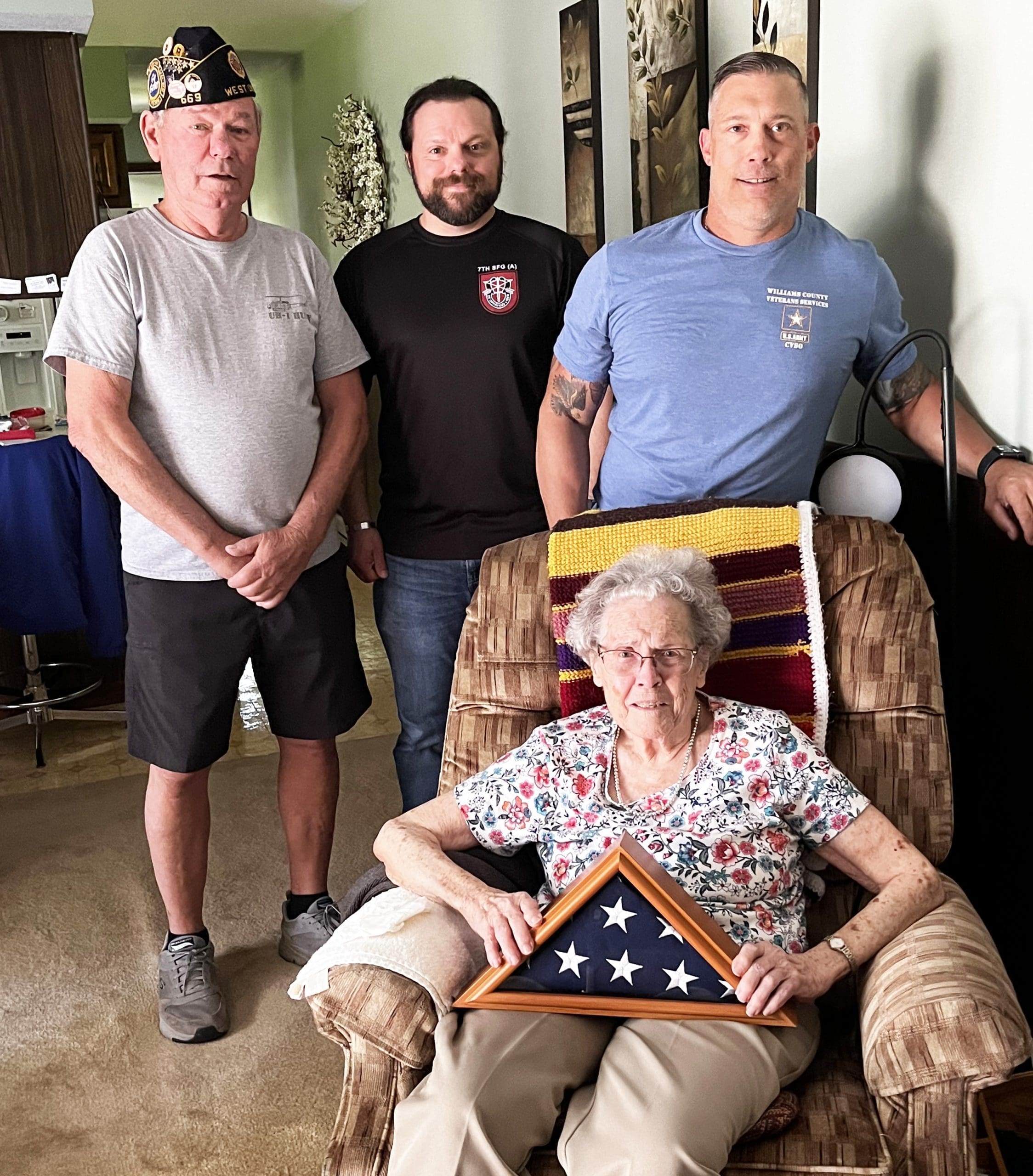 THANK YOU FOR YOUR SERVICE … Helen Stewart (front) was presented an American Flag by local veteran post members (back, left to right) Ed Shilling, Greg Hug, and Dan Bonney. (PHOTO PROVIDED / THE VILLAGE REPORTER)