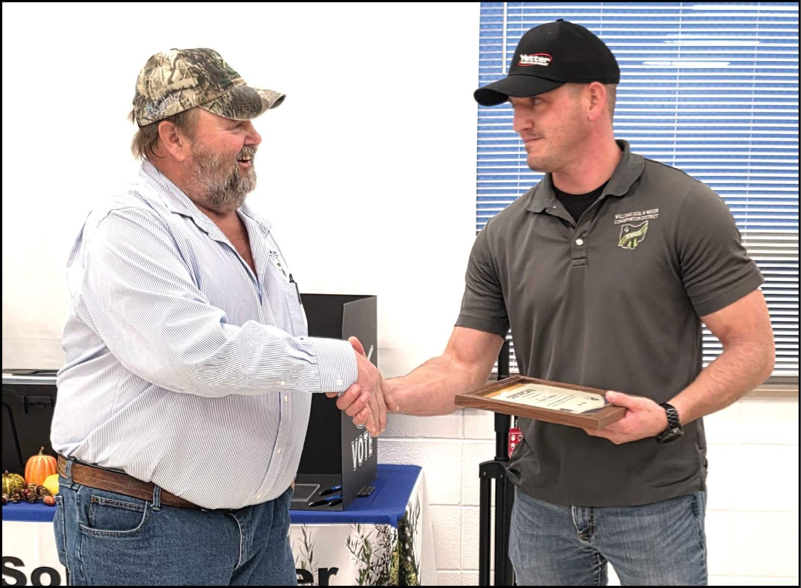 Williams County SWCD district technician Josh Imber was awarded his five-year pin for his longtime service to the district. The purpose of the annual meeting was the election of two new members to the board of supervisors.