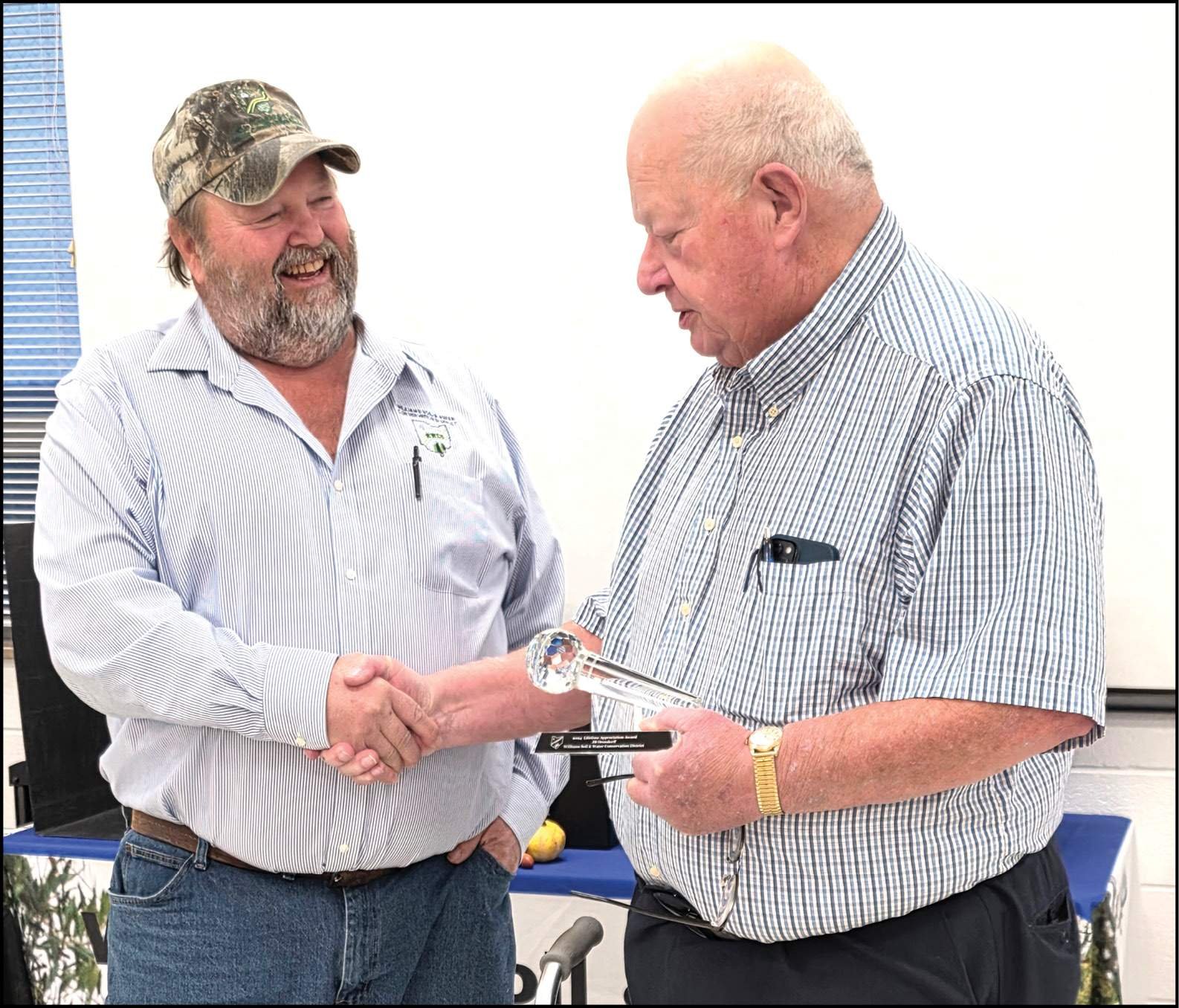 LIFETIME APPRECIATION AWARD … JB Orendorff (right) received the Williams County Soil and Water Conservation District Lifetime Appreciation Award from Bob Short (left), Williams County SWCD Chairman.