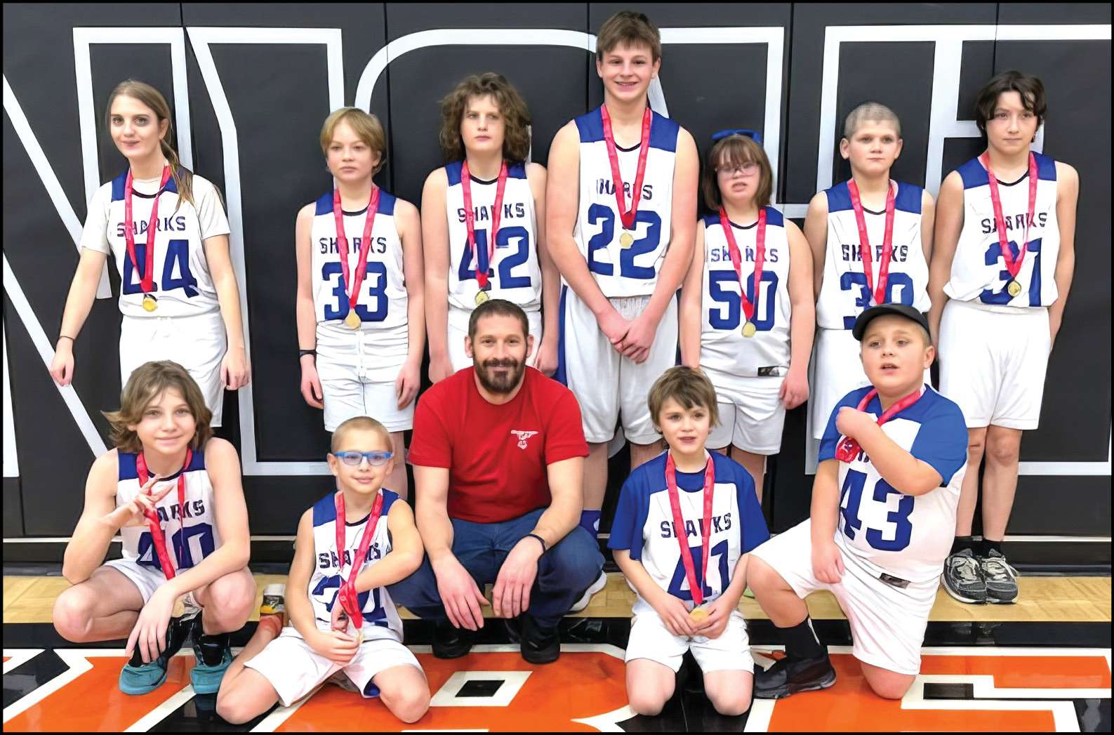 SCHOOL AGE D1 … (Front) Landyn Myers, TJ Sieradzki, Coach Bill Albertson, L J Pittman, Weston Flower. (Back) Kasey Murphy, Elliot Covington, Quinten Carpenter, Koleton McCandless, Sterling Snider, Jeffrey Pittman, Douglas Northrup III.