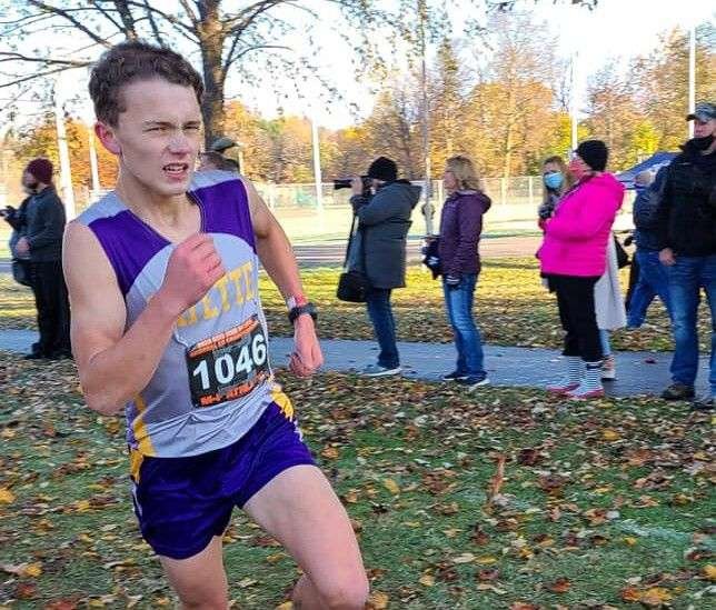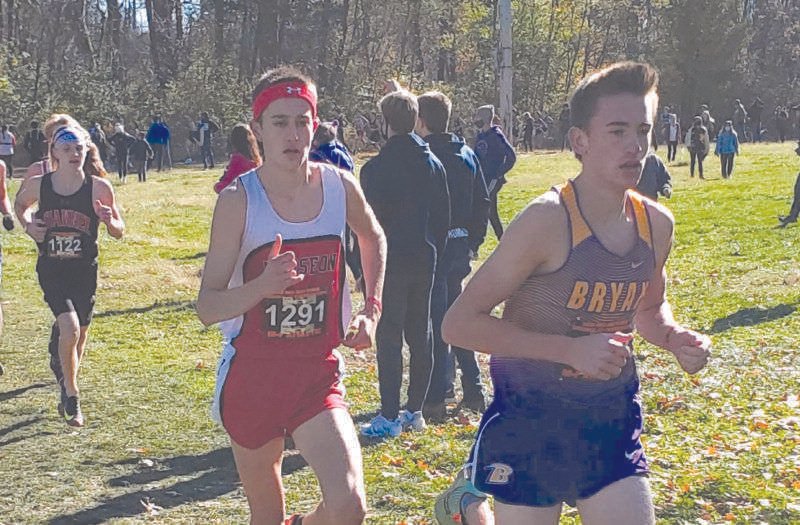 EYE ON THE FINISH LINE … Quinn Mitchell of Fayette heads for the finish line in the Division III Regional race at Tiffin. Mitchell had a time of 16:59 to finish 19th and qualify for the State meet. (PHOTO COURTESY OF ROBYN BINGMAN)
