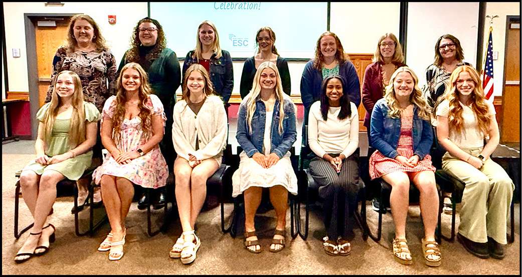 WILLIAMS COUNTY … Front row from left, Scholarship Winners: Kenley Routt (Millcreek- West Unity); Kylie Perry (Edgerton); Grace Slagle (Bryan); Grace Froelich (Stryker); Caroline Dick (Montpelier); Ella Osborn (Edon, Williams County Winner); Cailyn Meyers (North Central). Back row from left, Honored Teachers: Cristin Hagans (Millcreek-West Unity); Olivia Schaffner (Edgerton); Kathryn Rockey (Bryan); Jade Eberle (Stryker); Jayme Balasko (Montpelier); Annette Peckham (Edon); Marcia Geiser (North Central).