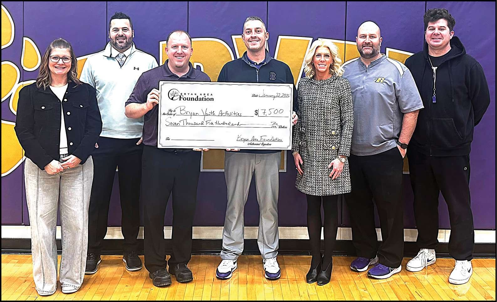 SUPPORTING YOUTH SPORTS … The Bryan Youth Activities Fund, held at the Bryan Area Foundation, awarded $7,500 in grants to various Bryan, Ohio, youth sports groups. Each program recipient will use the money for their diverse athletic needs, ultimately allowing more local children to participate in that sport and instill in all competitors the value of teamwork, healthy lifestyles, leadership, and determination. Pictured left to right during the check presentation are Bryan Swim Team Association representative Nichole Wallace, Bryan Girls’ Softball Association representative Brett Cordy, Bryan Soccer Association representative Brian Roehrig, Bryan Baseball Association representative Jeff Inselmann, Bryan Area Foundation President/CEO Amy Miller, Bryan Little Bears Football Program representative Nathan Keel, and Bryan Youth Basketball representative Casey Spitnale.