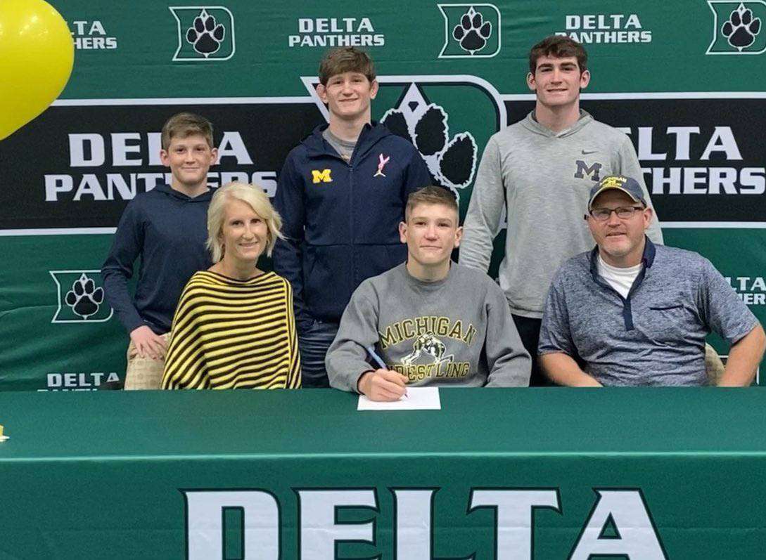 The wrestling pipeline between Delta, Ohio and Ann Arbor, Michigan continues. Last week Zack Mattin, seated at the table with his parents Mike and Leigh Mattin, signed to join his brothers Cole and Drew as a member of the University of Michigan wrestling program. “I decided on going to the University of Michigan due to the university’s academic and athletic standards”, said Mattin when explaining his choice. “The culture that the school portrays is something very special to me. And I am also very excited to be joining my brothers in Ann Arbor next year.”